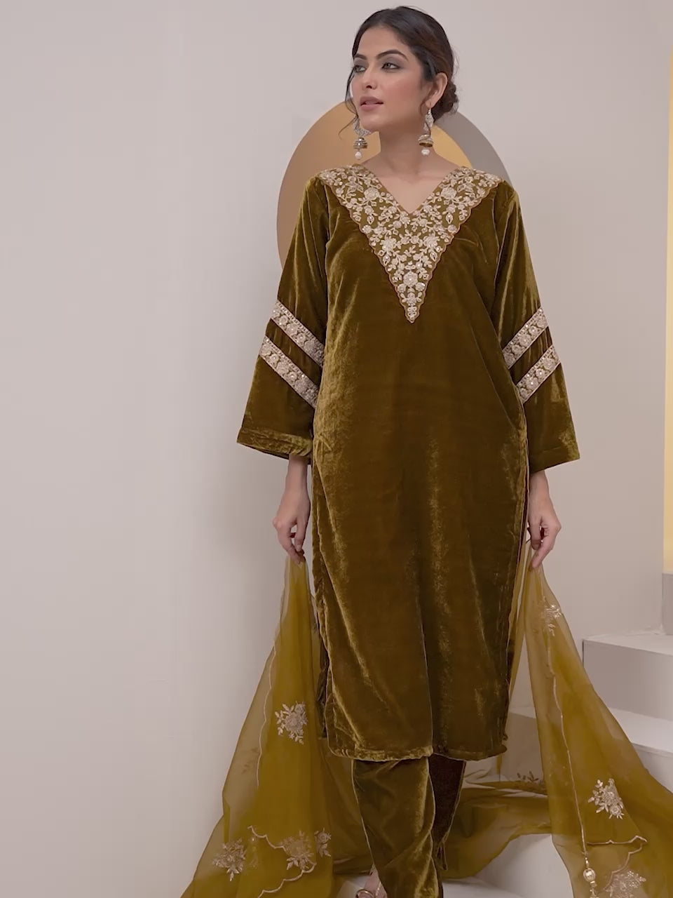 Deep Olive Velvet Embroidered Straight Kurta Set With Straight Bottom And Scalloped Dupatta Sale price₹ 2,729 Regular price₹ 8,399