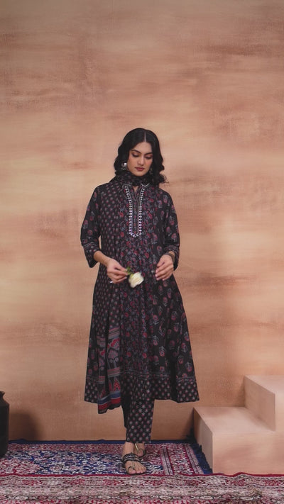 Comfy Black Cotton floral printed Aline Fit kurta set with dupatta Sale price₹ 2,759 Regular price₹ 8,499