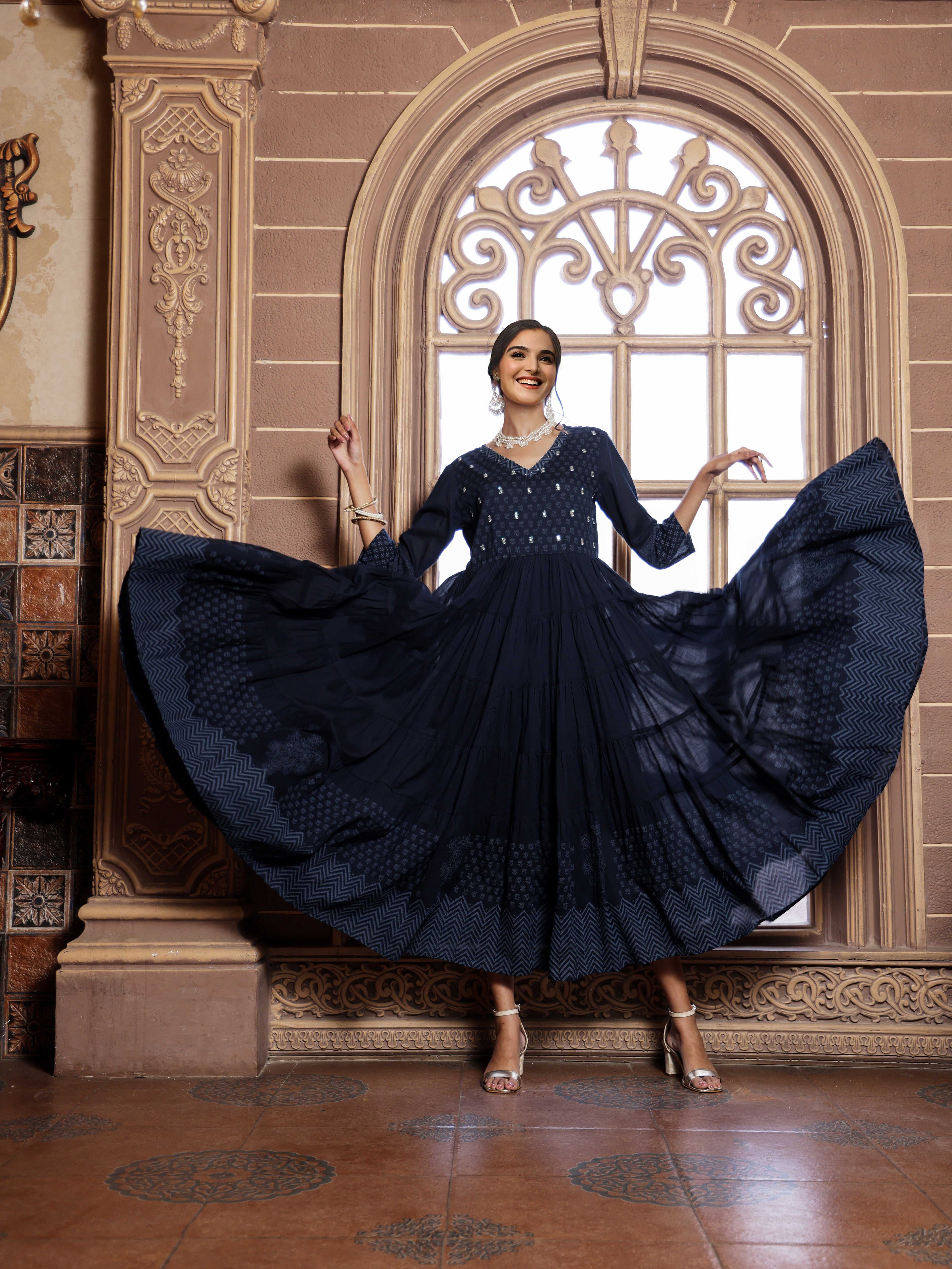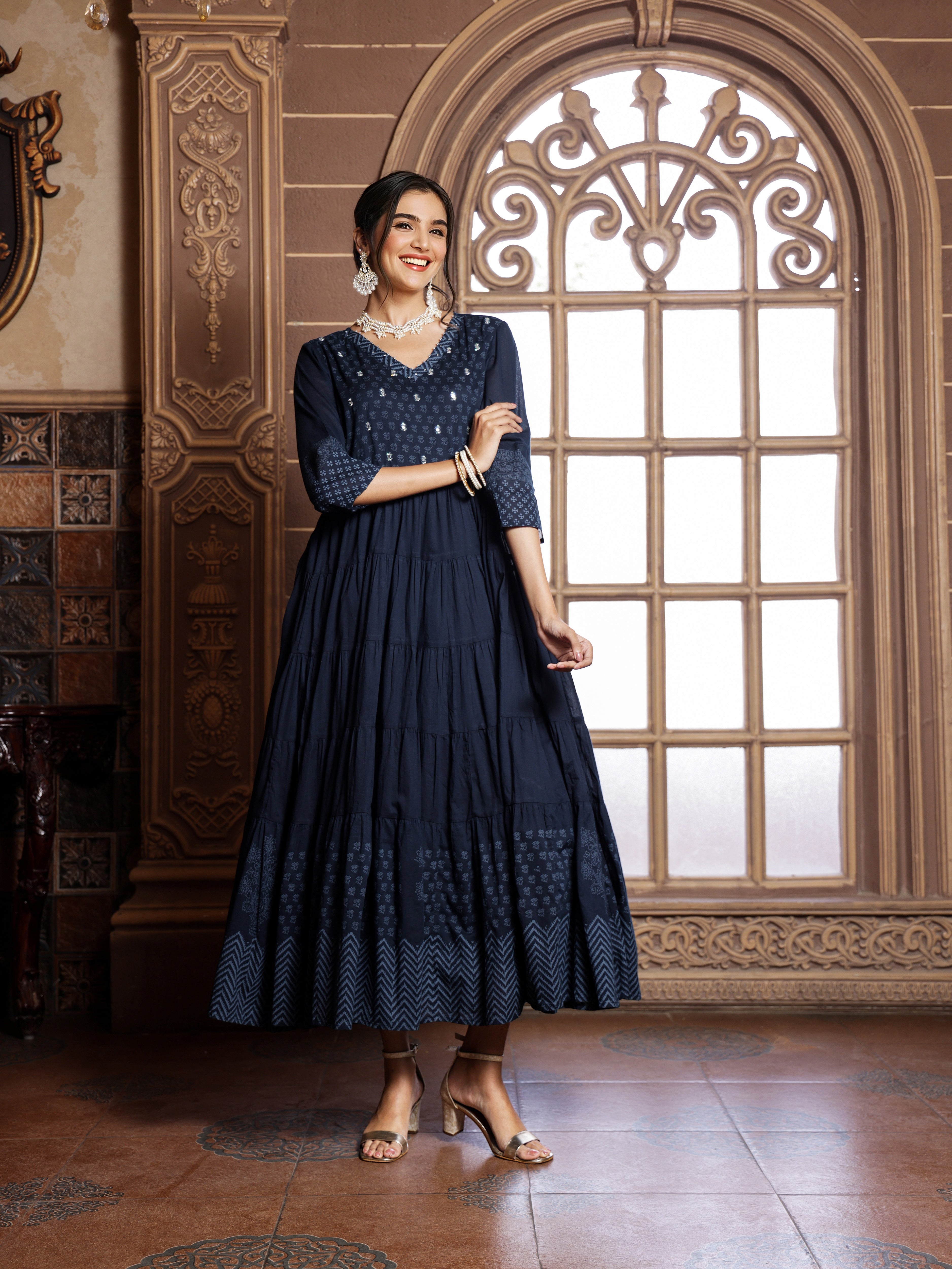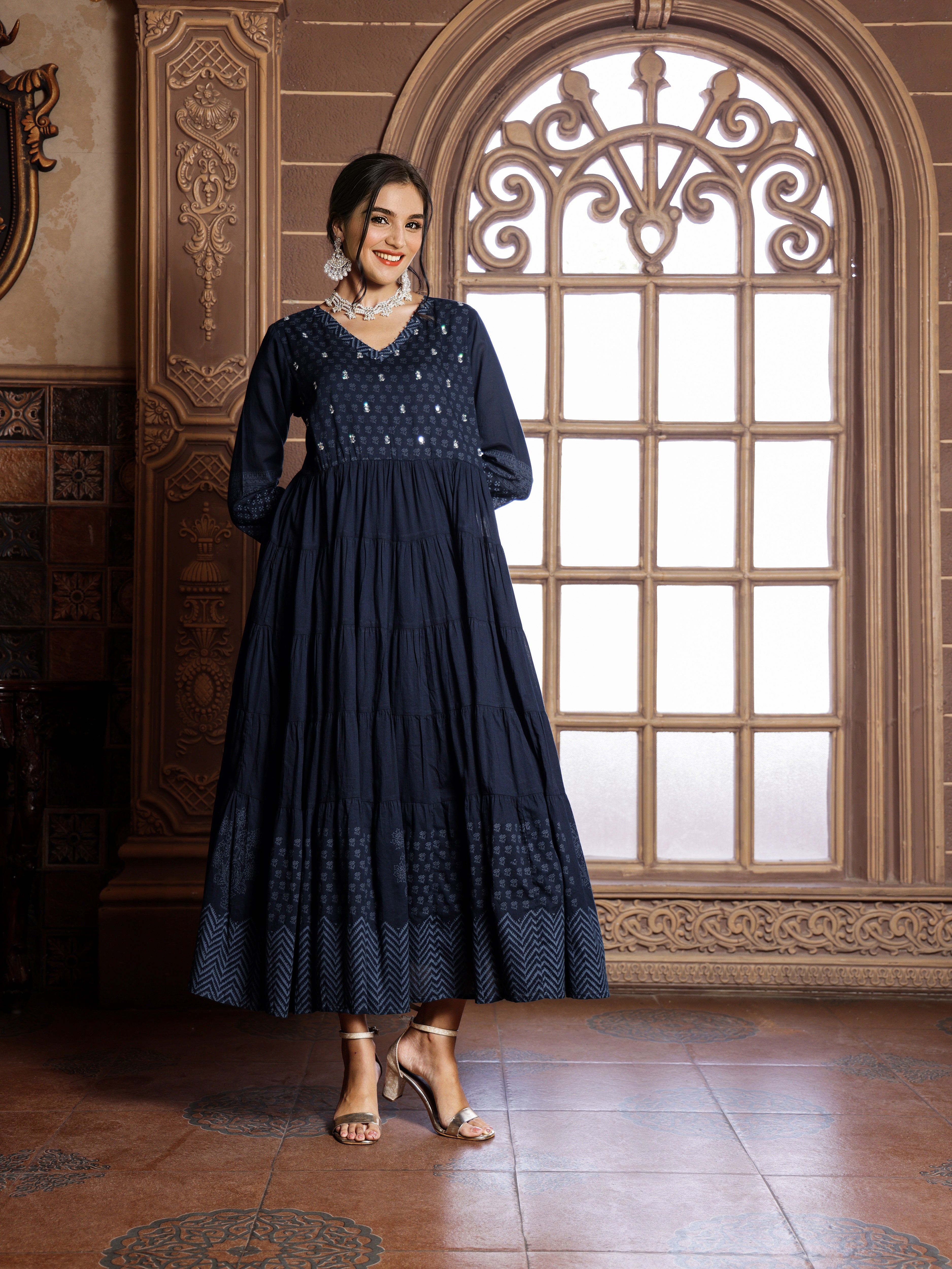 Cotton Blue Ethnic Printed Tiered Flare Maxi Dress With Tie-Up Sale price₹ 3,059 Regular price₹ 9,399