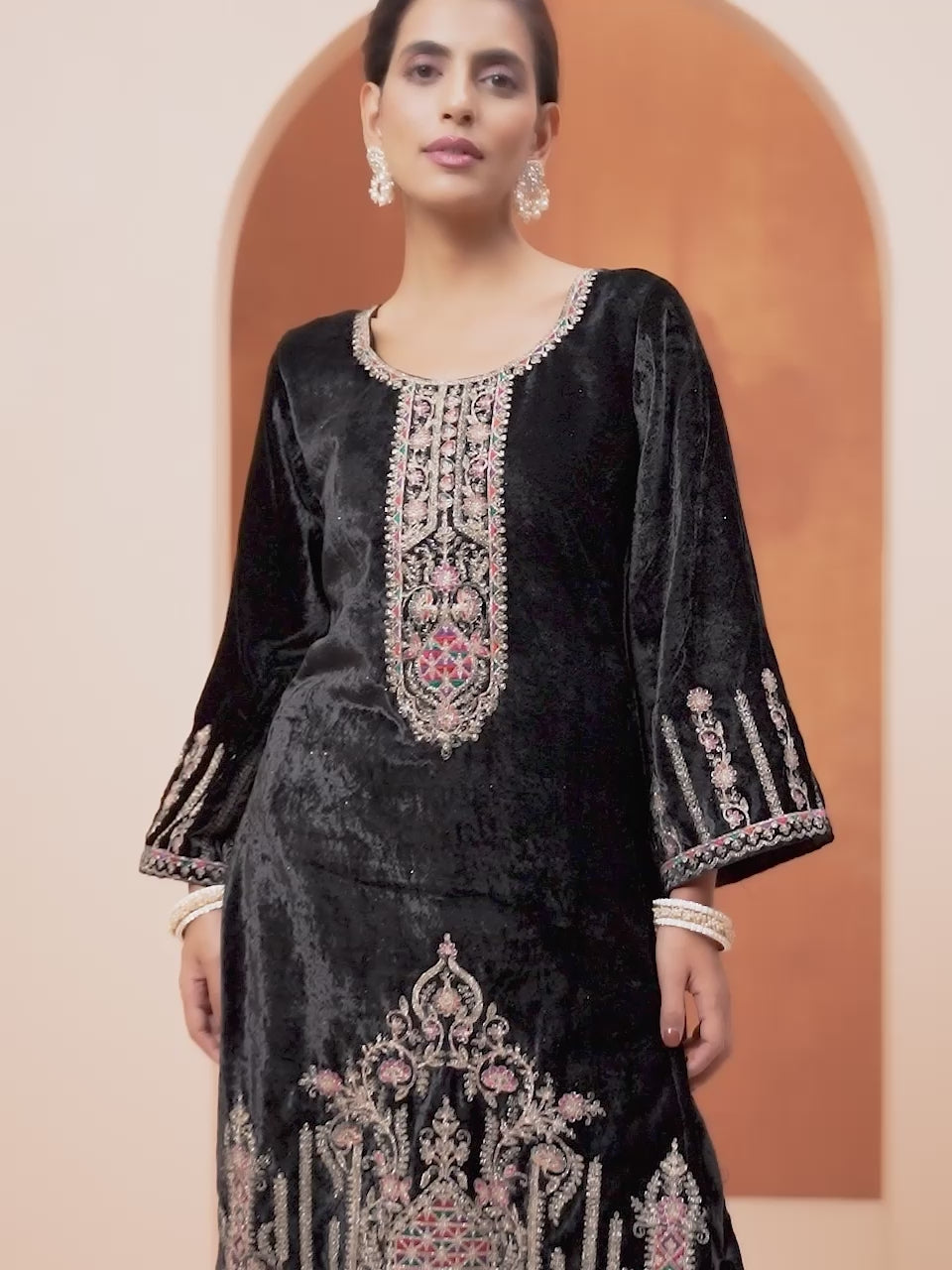 Black Velvet Zari Embroidered Straight Kurta Set With Straight Bottom