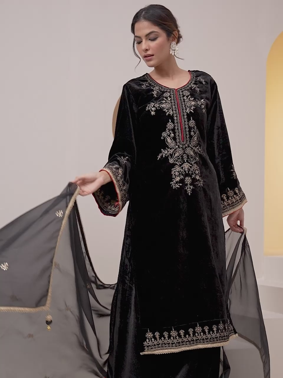 Rich Black Velvet Embroidered Straight Kurta Set With Palazzo Bottom And Dupatta Sale price₹ 3,509 Regular price₹ 10,799