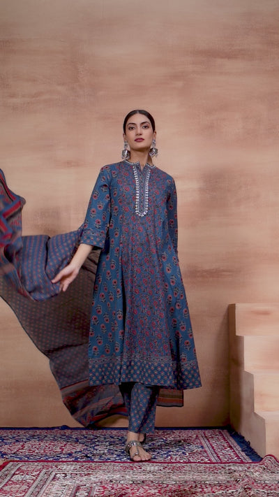 Comfy Blue Cotton floral printed Aline Fit kurta set with dupatta