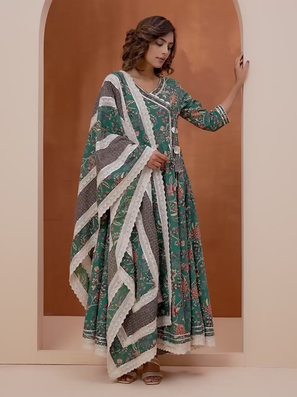 Graceful Cotton Green Floral Printed Angrakha Kurta With Straight Bottom And Cotton Printed Dupatta
