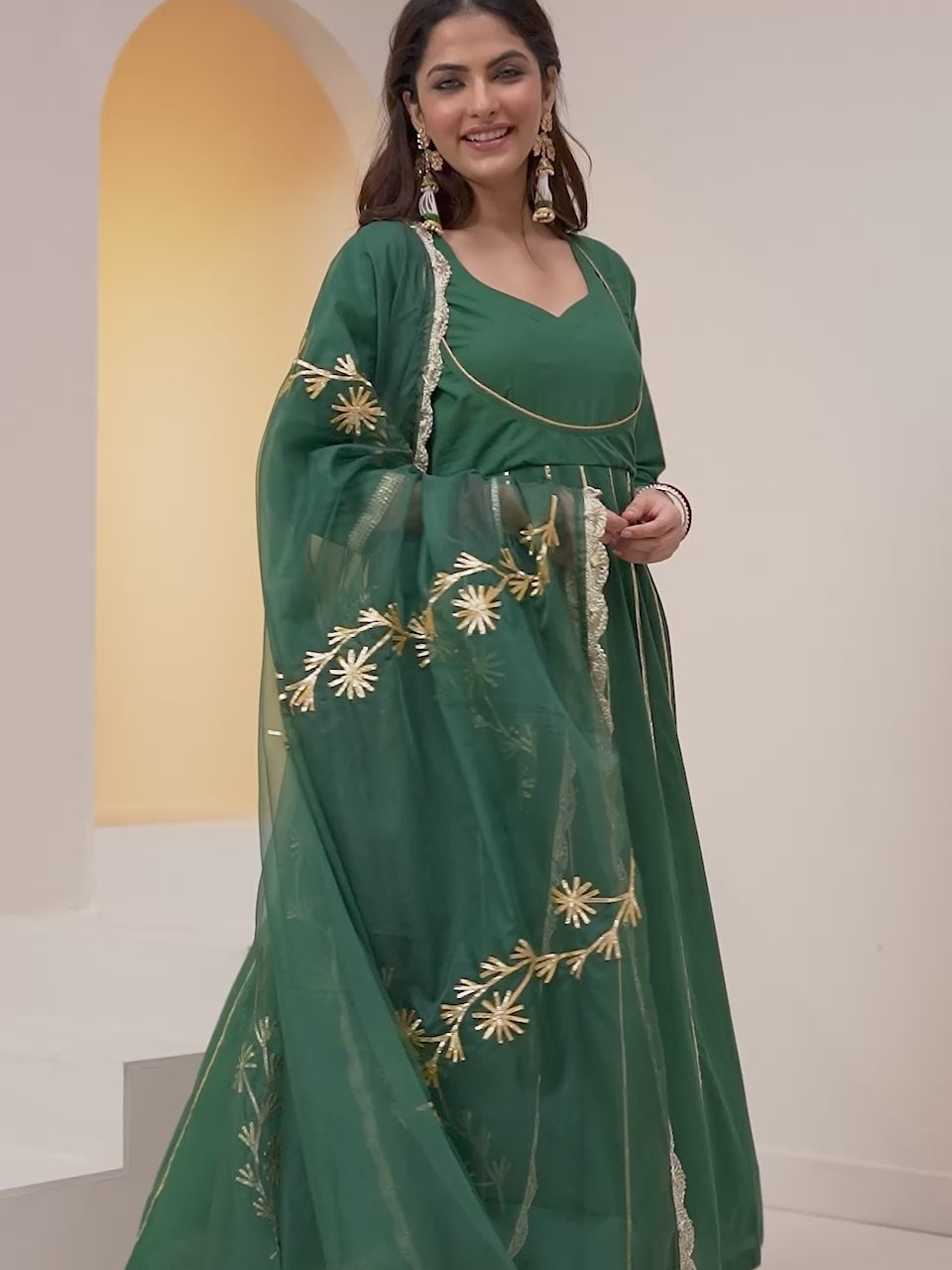 Graceful Green Cotton Blend Zari Embroidery Fit And Flare kurta set with dupatta