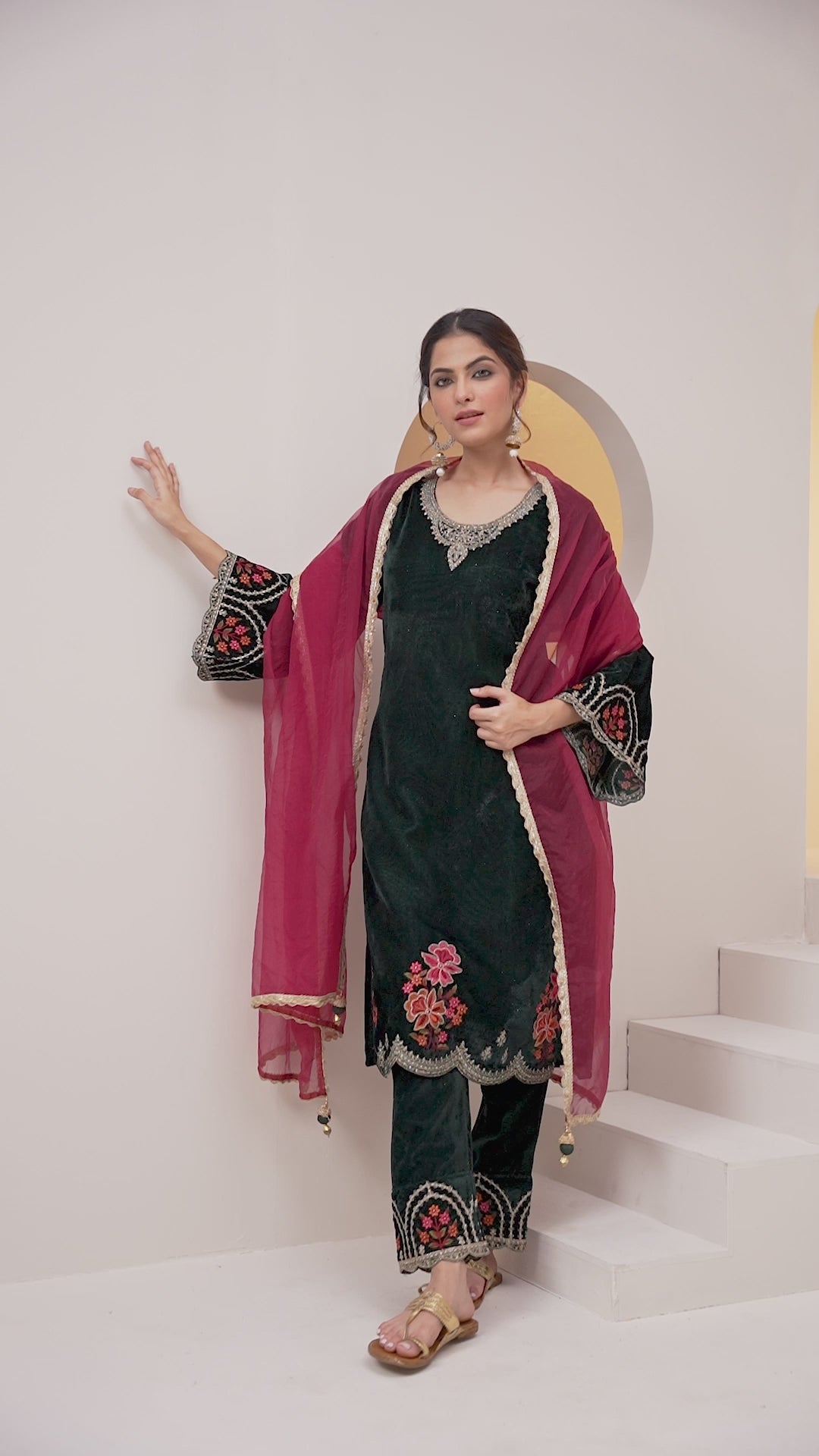 Rich Green Velvet Zari Embroidered Straight Kurta Set With Dupatta