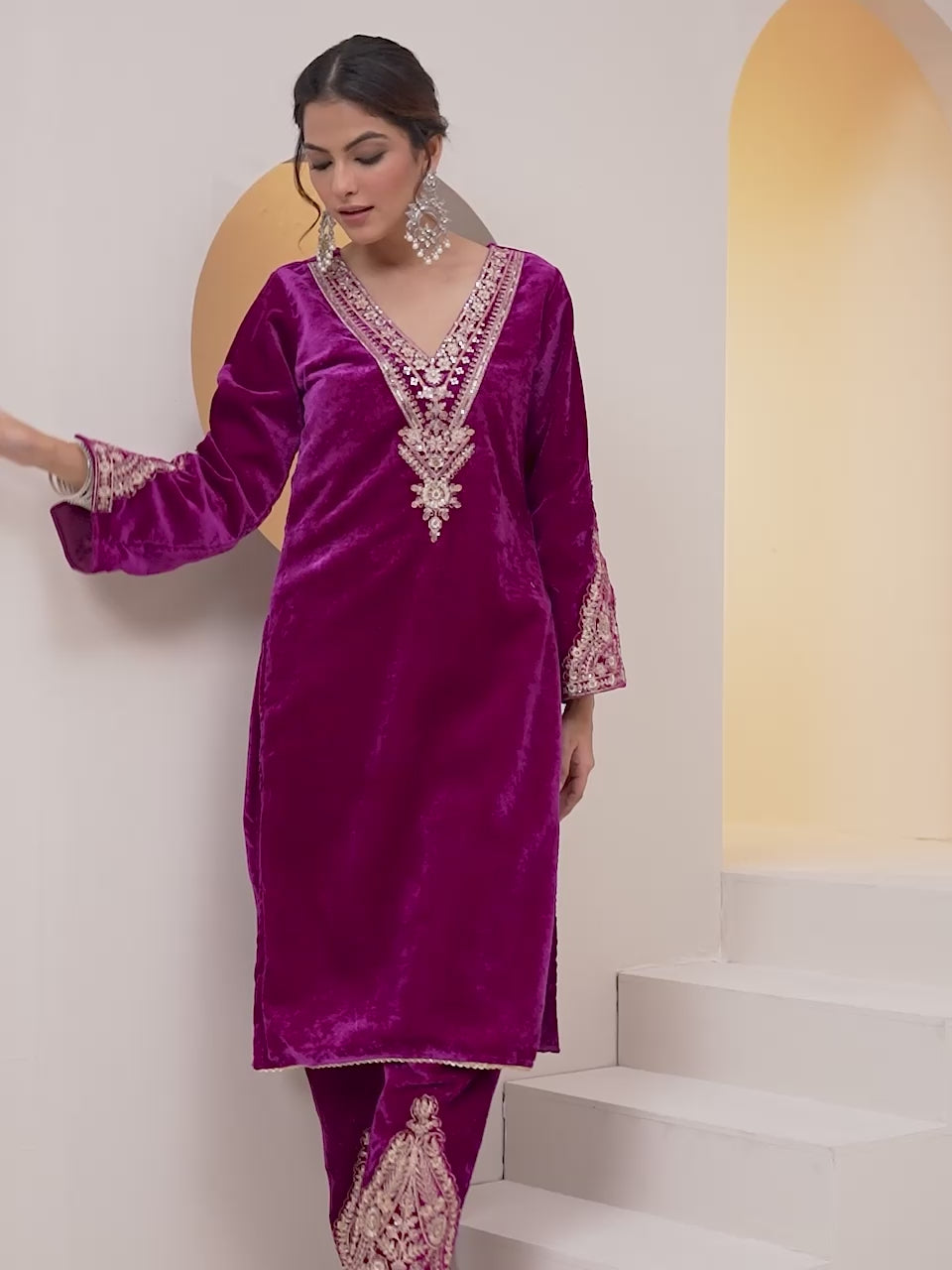 Rich Magenta Velvet Embroidered Straight Kurta Set With Straight Bottom Sale price₹ 2,599 Regular price₹ 7,999