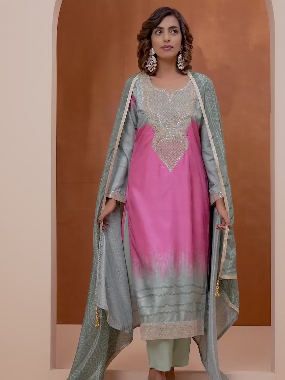 Pink Chinon Zari Embroidered Straight Kurta Set With Printed Dupatta