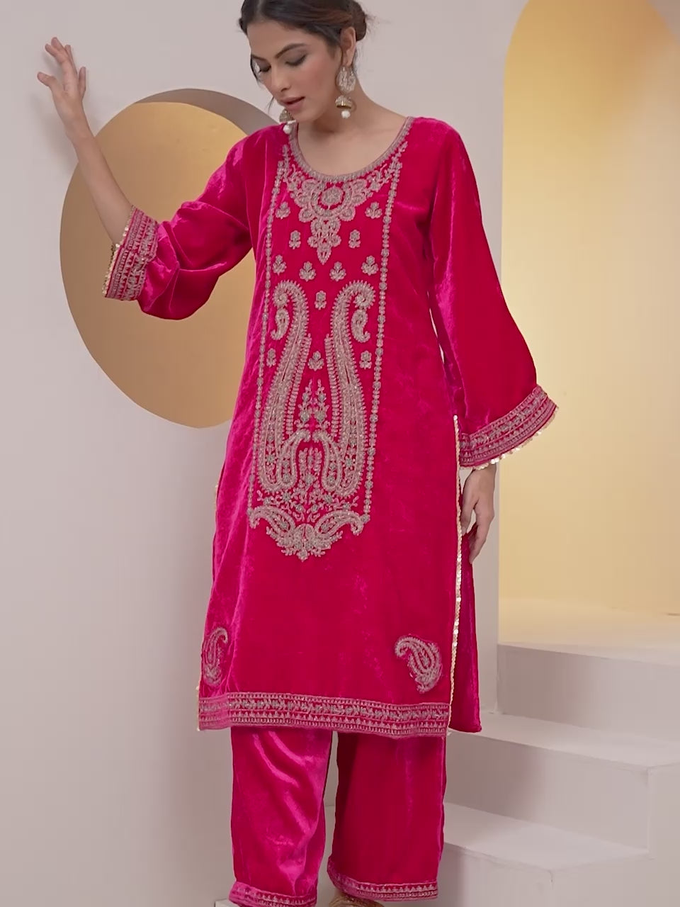 Pink Velvet Zari Embroidered Straight Kurta Set With Flared Bottom