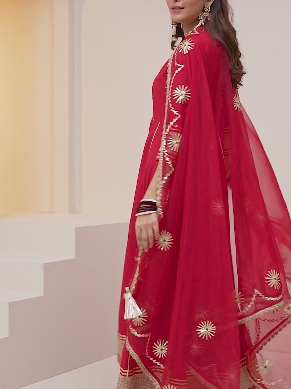 Graceful Red Cotton Blend Zari embroidery Fit And Flare kurta set with dupatta